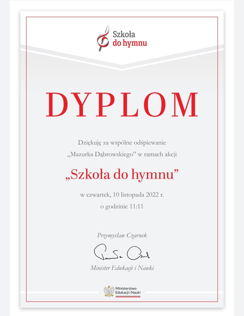Szanowni Państwo Dyrektorzy, w imieniu Ministra Edukacji i Nauki Przemysława Czarnka serdecznie dziękujemy za udział w akcji „Szkoła do hymnu”. Miło nam poinformować, że w tegorocznej inicjatywie wzięło udział blisko 20,5 tys. przedszkoli, szkół i placówek oświatowych z kraju oraz prawie 360 placówek polonijnych z całego świata. Cieszymy się, że 10 listopada o godz. 11:11 byli Państwo z nami! W załączeniu przekazujemy pamiątkowy dyplom. Zachęcamy do zapoznania się z komunika