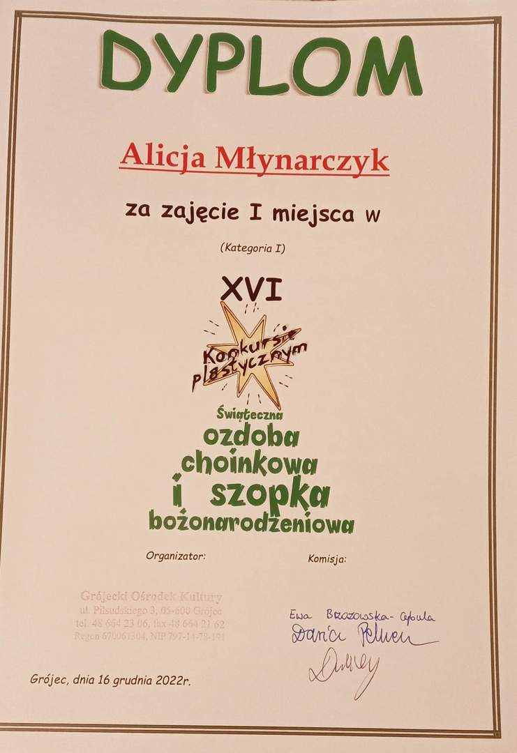 1 grudnia 2022 r. w Grójeckim Ośrodku Kultury został rozstrzygnięty XVI konkurs plastyczny „Świąteczna ozdoba choinkowa i szopka bożonarodzeniowa”. Z pośród 67 prac 🥇pierwsze miejsce 🥇z KATEGORII I - OZDOBA CHOINKOWA zajęła Alicja Młynarczyk z grupy "Wiewiórki" W dniu 18 grudnia nastąpiło wręczenie nagród. Serdecznie gratulujemy.