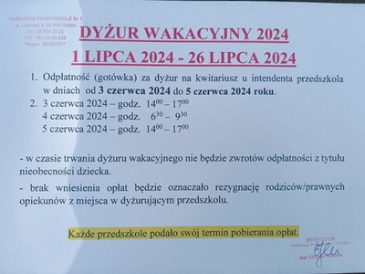 Odpłatności za dyżur wakacyjny